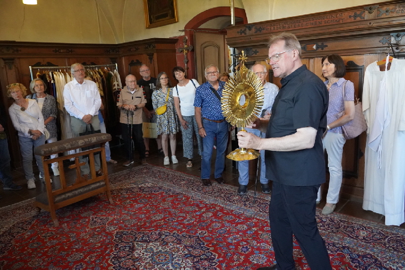 Der Führungstermin zur Sommersonnenwende war ja entscheidend vom Himmel beeinflußt worden. Gegen Mittag wahrer Ortszeit schuf die strahlende Sonne einen prächtigen Lichtteppich, der uns bis hin zum Altar führte. Dort gab es viel zu erklären und zu zeigen, besonders auch im Anschluß daran in den Räumlichkeiten der Sakristei, wo wir anschaulich mit katholischer Liturgie einst und jetzt vertraut gemacht wurden.