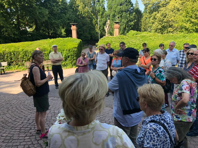 Monika Spatz (links), die anerkannte Kennerin des Friedhofs und Autorin des Buches „Steine erzählen Geschichte – Ein Rundgang über den Altstadtfriedhof in Aschaffenburg”, erläuterte die Geschichte des Friedhofs und berichtete, was die Grabmale über die Personen und deren Zeit in unserer Stadt mitteilen. Josef Forman (2. von links), Vorsitzender der Aschaffenburger Altstadtfreunde, hatte zuvor die vielen Gäste begrüßt. Auch 2023 beteiligte sich der Verein an den Aschaffenburger Kulturtagen mit großem Erfolg. Er hatte zu dem Rundgang eingeladen, weil das Motto in diesem Jahr „Kommunikation“ lautete. Und tatsächlich ging es um Kommunikation: Was sagt uns der Altstadtfriedhof mit seiner Gestaltung, mit den Gräbern und den Denkmälern? Josef Forman: „Hier können wir uns in die Lebensgeschichte vieler Persönlichkeiten, ja sogar in die Geschichte Aschaffenburgs vertiefen. Der Altstadtfriedhof ist ein Ort der Stille und Besinnung, aber auch eine grüne Oase mitten in der Stadt.“